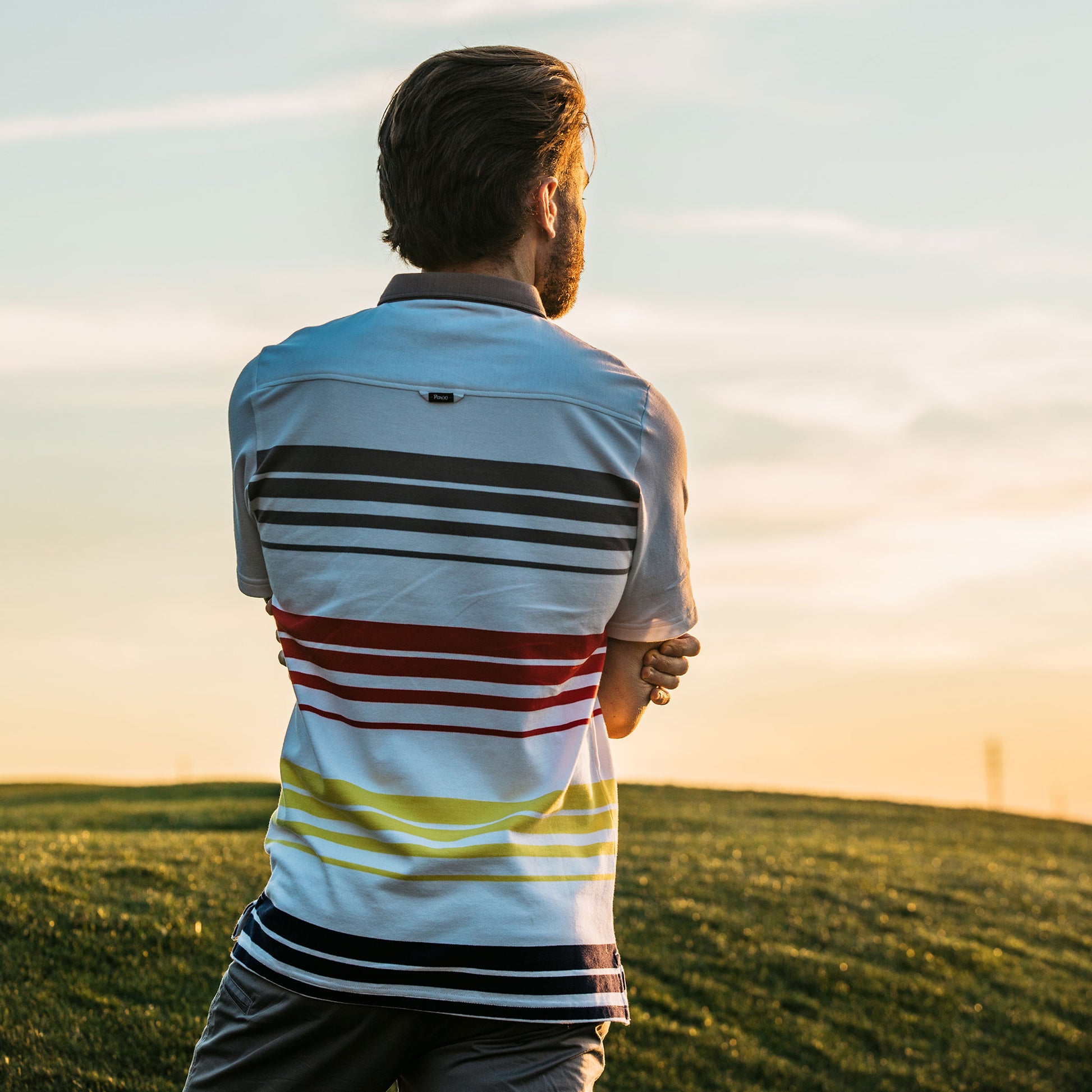 Inspired by Lee “Buck” Trevino, 6 Time Major Champion, Mexican-American Golf Icon, The Buck Polo introduces our stretch cotton yarn dye stripe pique. The collar literally bestows a button down appearance. Presented in White Multi-stripe, the Buck is also available in Eclipse and Filigree. This top coordinates directly with the Knight TT Cap.