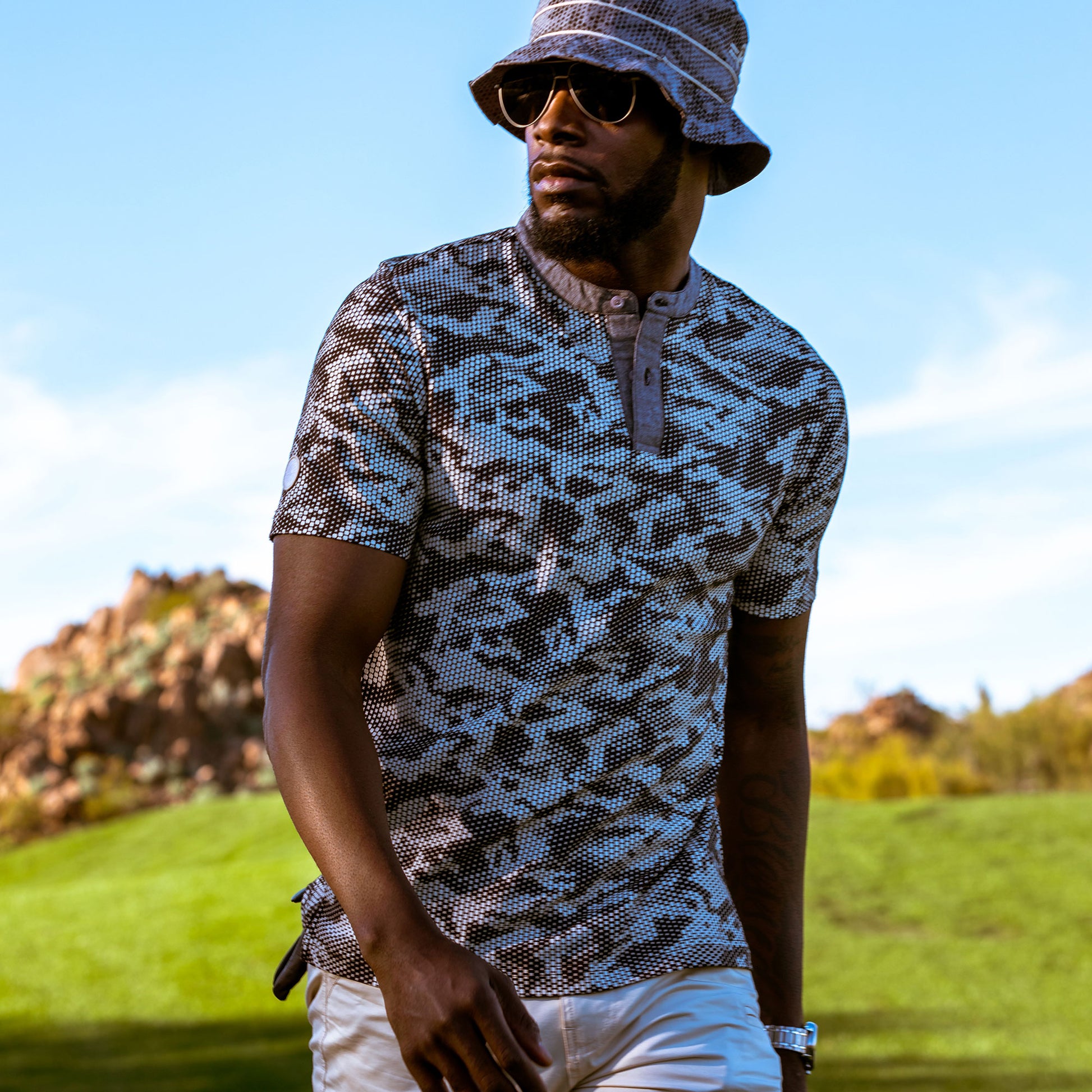 With this style we pay tribute to Hisako “Chako” Higuchi, first Asian LPGA Champion.The Chako M XC uses laser technology to apply the X Camo pattern on to 40 singles jersey. A Chambray collar and placket complete the henley style. This style is offered in Vindigo and Black, the Chako M XC can be paired with either the Daniel XC or the Ben XC.