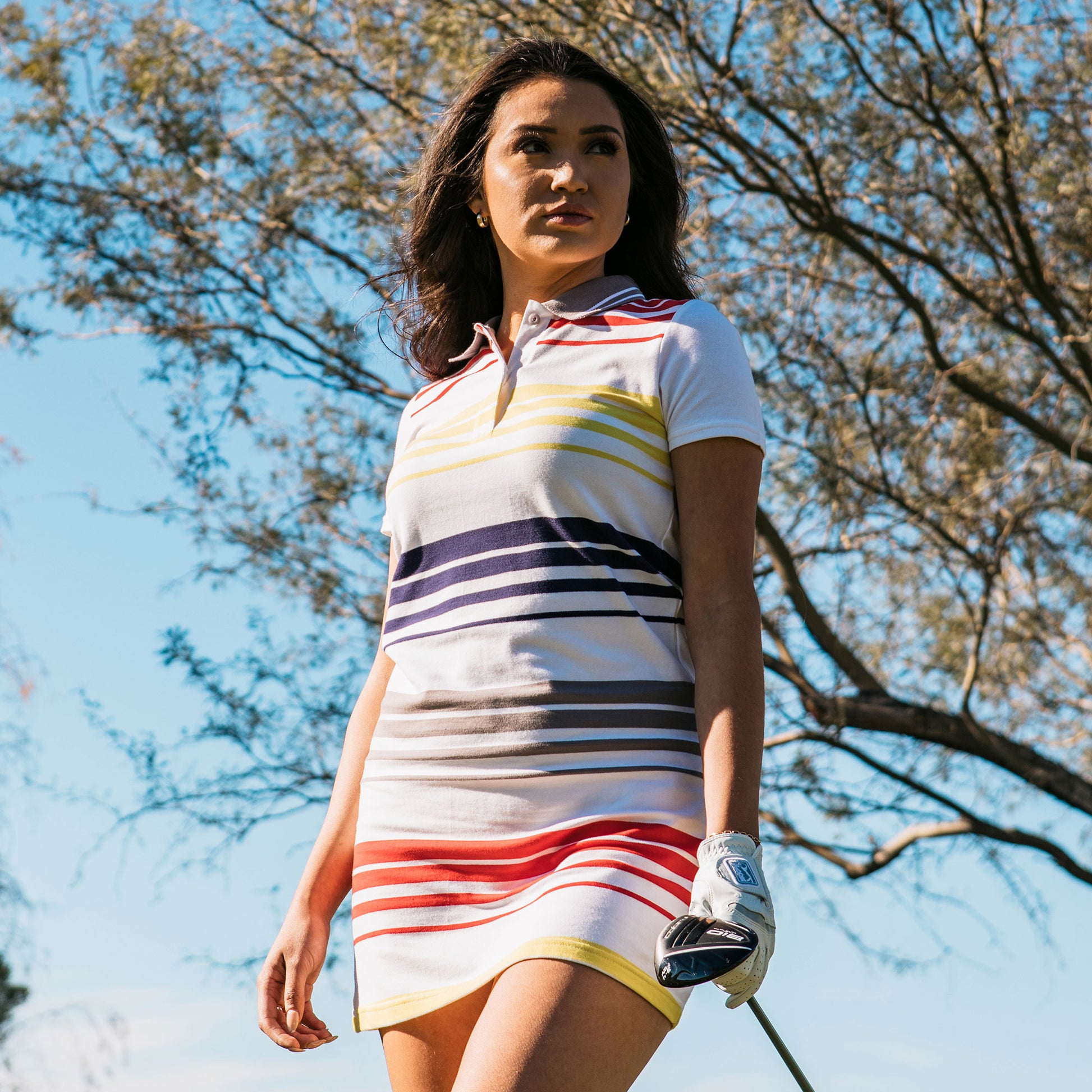 Inspired by Nancy "Marie" Lopez, 3 Time LPGA Major Champion, the Marie DR Dress borrows artwork from the Boom Boom Polo and transforms them into a feminine silhouette. The allover print draws inspiration from the earth, wind and sea elements. The X Stripe jacquard rib polo provide tasteful branding to this dress which can easily withstand a round on the course or a few sets on the hard court. Pair with the Neale Visor or the Jesper WV Snapback Cap to complete the ensemble.