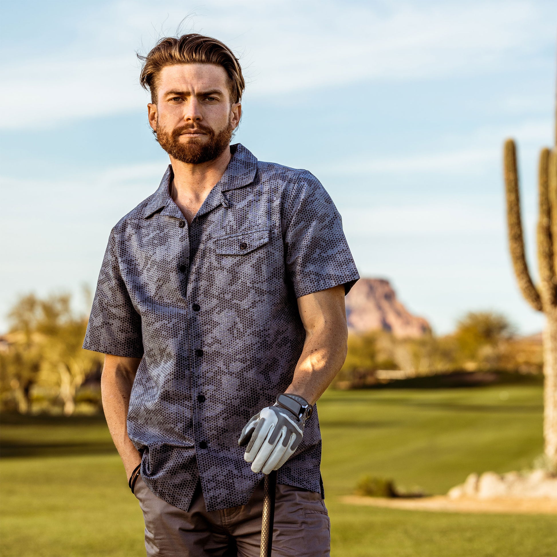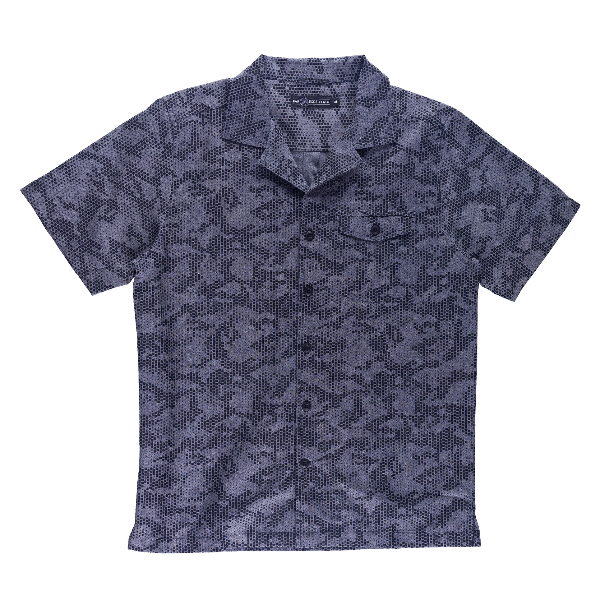 With this style we pay tribute to Gene “Squire” Sarazen, one of only five Grand Slam of Golf Champions. Made in our signature X Camo chambray, the Squire XC camp shirt is the perfect top on the course or apres-golf. Available in Black or Blue Chambray the Squire can be dressed up or worn casual.